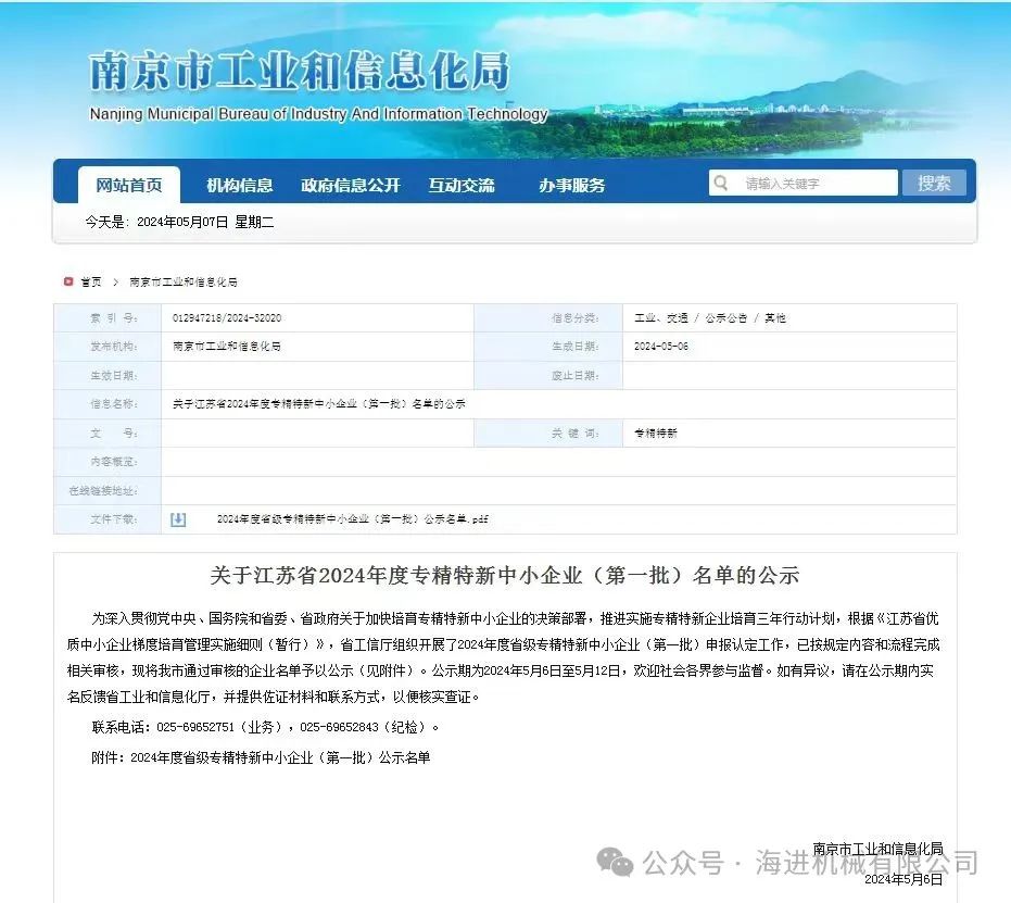 • 海進機械榮獲“2024年度省級專精特新中小企業(yè)”認證